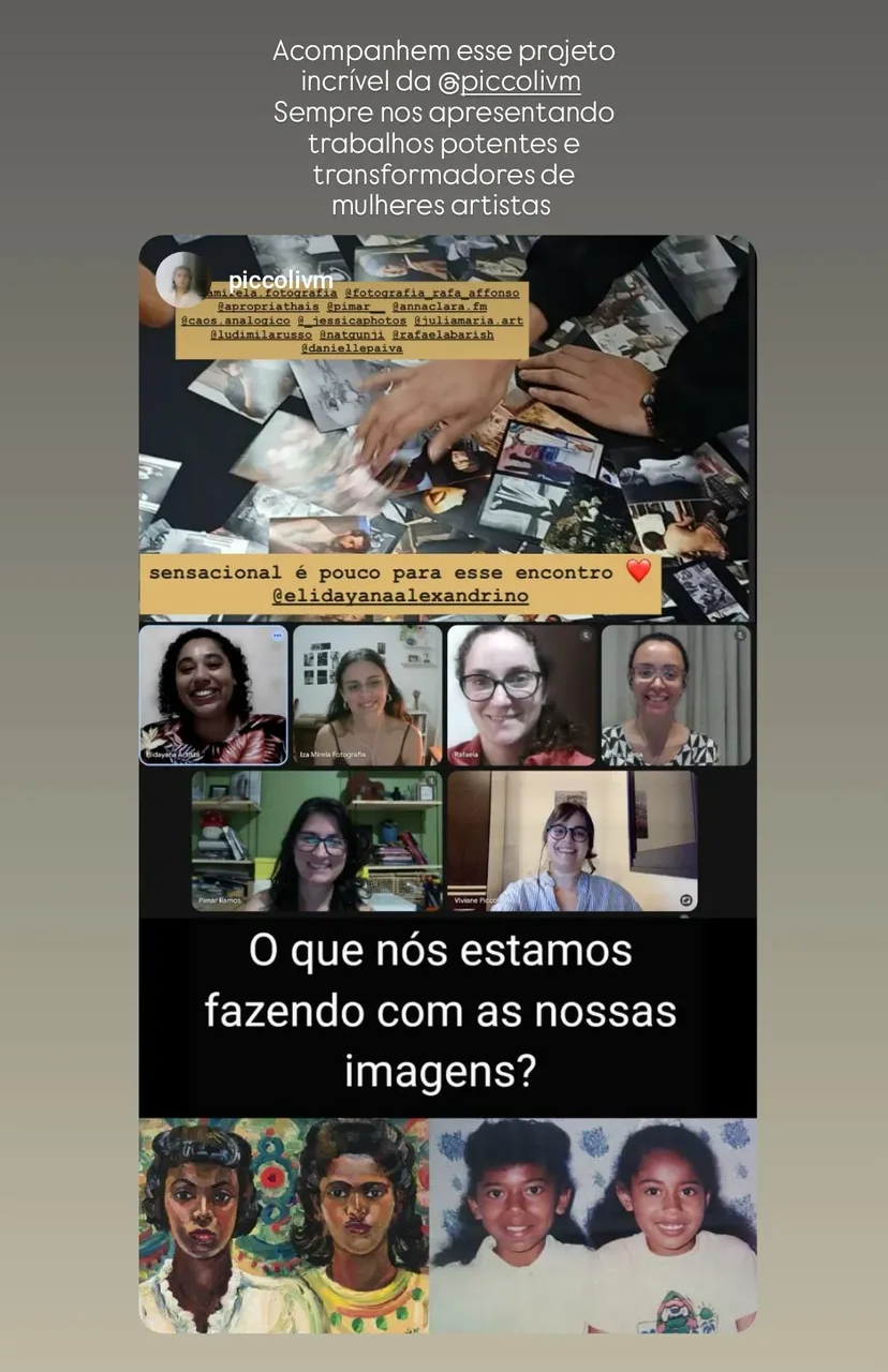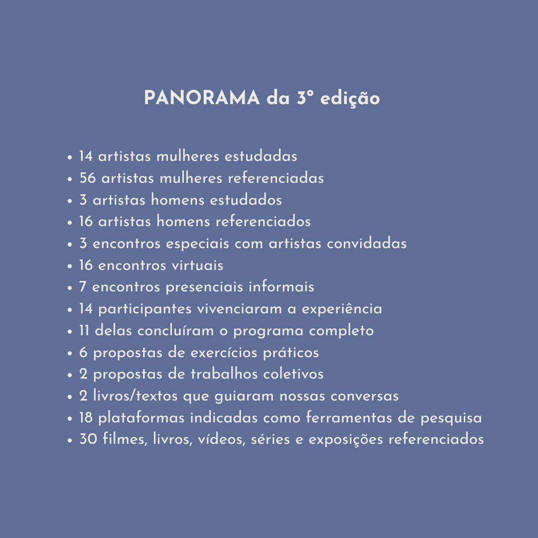 Criamos um espaço de troca, escuta e apoio mútuo, onde cada participante pode iniciar ou aprofundar seu processo criativo em diálogo com outras artistas. Por meio de análise de portfólios, discussões conceituais, estudo de referências — com foco em mulheres na fotografia e nas artes visuais — e atividades práticas, incentivamos o desenvolvimento de narrativas autorais conectadas às vivências pessoais.